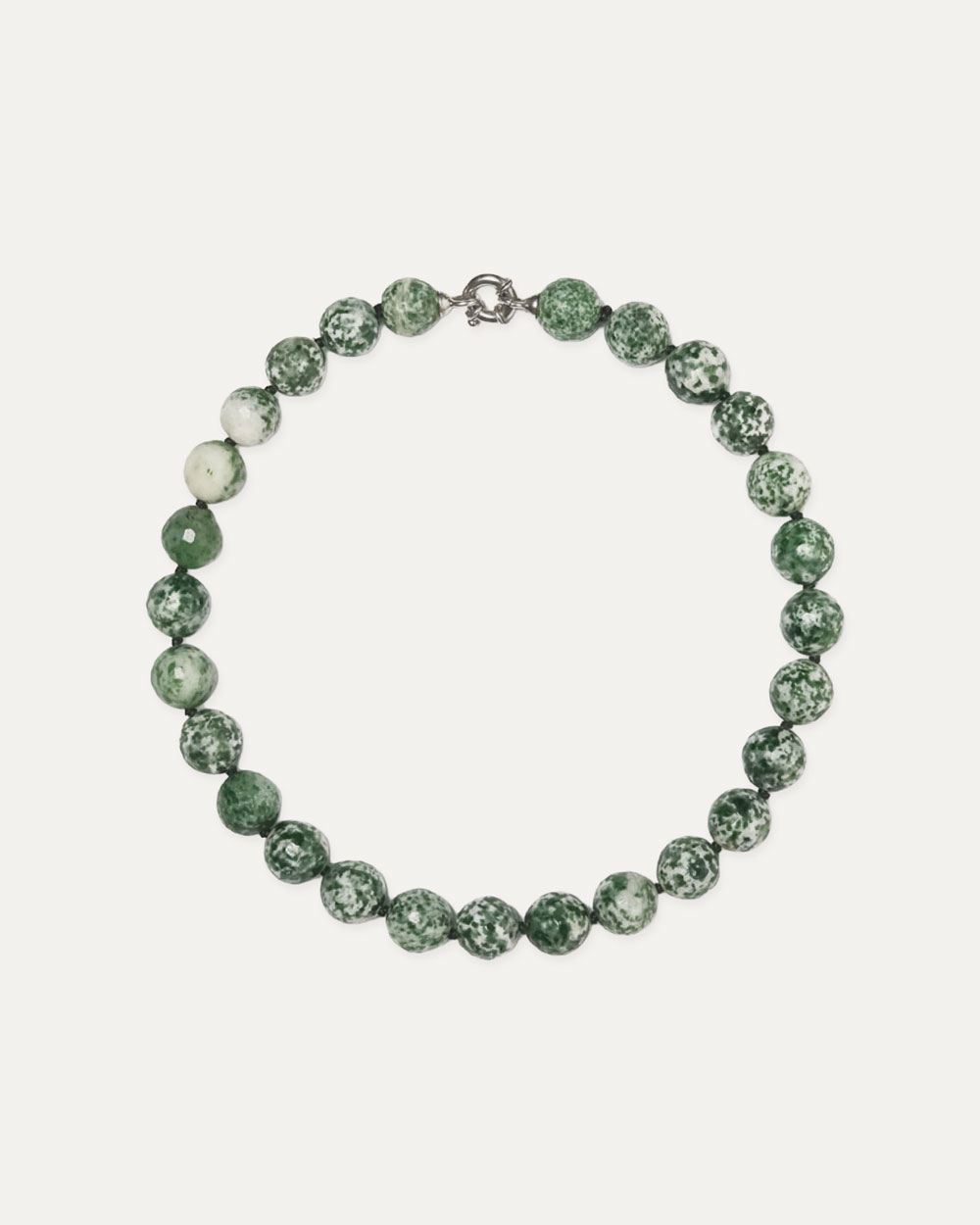 Alfred is a strand of green spot jasper, each 14 mm bead patterned with soft greens and whites like fragments of landscape. Every necklace is one of a kind, carrying nature’s quiet rhythm and grounding presence.